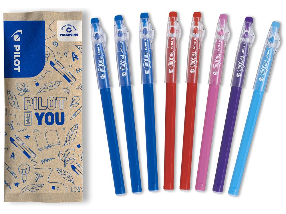 8 uitwisbare Pilot rollerpennen, 3 blauw, 2 rood, 1 roze, 1 paars, 1 turquoise!