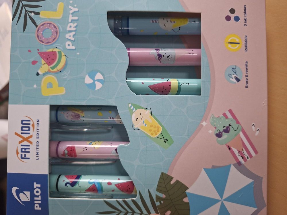 Set van 6 penne, uitgumbaar, hervulbaar en in drie inkt kleuren.