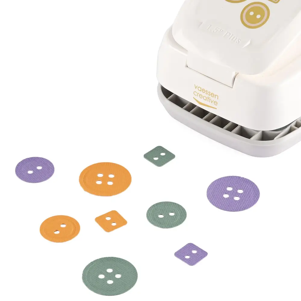 Met deze grote embossing figuurpons van Vaessen Creative stans je in één handbeweging drie knopen met reliëf (⌀ 2,6 cm, ⌀ 2 cm en 1,2 x 1,2 cm) uit papier, cardstock, foto’s en meer. Figuurponsen zijn de perfecte sidekicks voor het versieren van kaarten, scrapbookpagina’s, planners, labels en uitnodigingen. Pons eens in de zoveel tijd een aantal keer door aluminiumfolie om de pons te slijpen en scherp te houden.