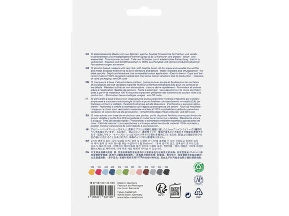 Set met 12 sketchmarkers op alcoholbasis. Marker is voorzien van twee punten: een zachte, flexibele penseelpunt voor grote vlakken en variabele lijndiktes en een finelinerpunt met metalen behuizing (0,6mm) voor contouren en details. Inkt is veegvast, waterbestendig en droogt snel. Hoge dekking door herhaaldelijk aanbrengen van de kleuren en streeploos te blenden. De doppen en de houder zijn gemaakt van 100% gerecycled materiaal en kunnen kleurvariaties vertonen door de productie. Doos met 12 kleuren.