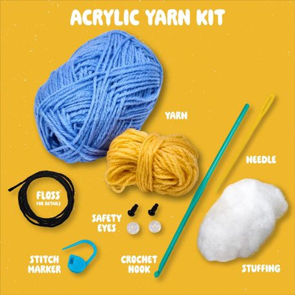 Complete set met garen, borduurdraad, vulling, plastic haaknaald, plastic naald, veiligheidsoogjes, steekmarkeerders en instructies. Het gehaakt project is 9.1x12.7x10.7 cm.